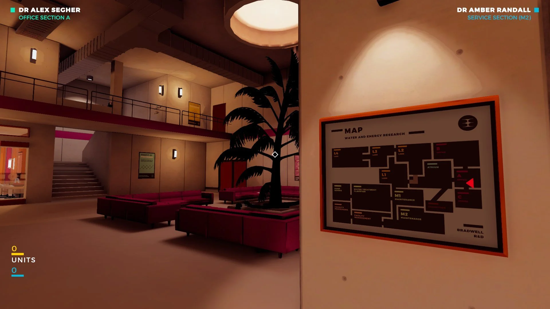Wayfinding graphics and colour coding for the various areas in the in-game facility.